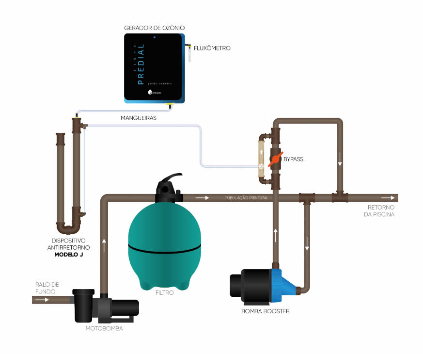Para garantir que o sistema de ozônio opere sem sobrecarregar a motobomba e o filtro principal, a Piscinacenter avalia a necessidade de dois componentes adicionais conforme a arquitetura da casa de máquinas: