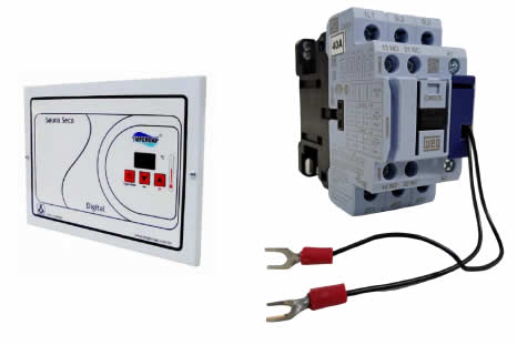 Esse conjunto da Impercap é o que controlam a sauna seca. Para um equipamento de 12kW, o painel sozinho não suportaria a carga elétrica, por isso o uso do contator é obrigatório e essencial para a segurança e durabilidade do sistema.